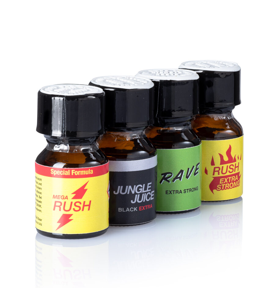 Night & Day Power Combo 4x10ml package with Mega Rush 10ml, Rush Extra Strong 10ml, Rave Extra Strong 10ml and Jungle Juice Black Extra 10ml. These four poppers products are often bought together, so we have created for you this poppers package with the classics. Benefit from the power combo for the day and all night.