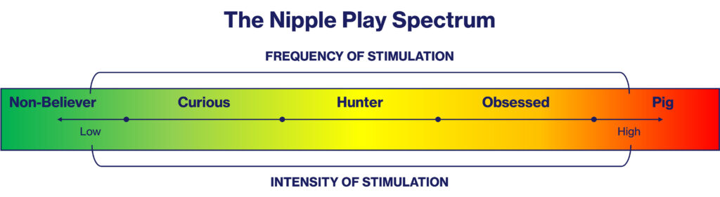 Pour ceux qui sont curieux, nous présentons une échelle ludique qui capture les niveaux de sensibilité et de plaisir des mamelons. Imagine ce spectre comme un modèle et passe de « l’incrédule du mamelon » à gauche à l’ultime « cochon de sein » à droite.