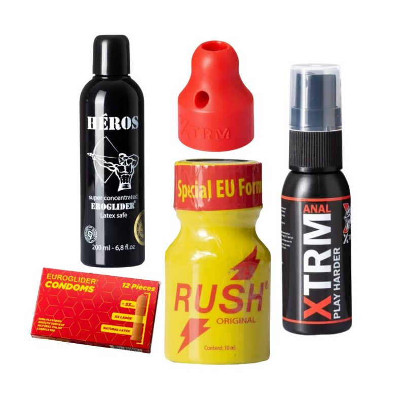 Tu es nouveau dans le monde gay et tu veux tout avoir lors de ton premier rendez-vous ? C’est précisément pour cela que nous avons créé pour toi le Gay Starter Pack. Notre poppers Rush Original 10ml est le poppers le plus populaire au monde. Avec cela, tu es sûr d’avoir déjà le premier accroche-regard sur ta flacon jaune. Grâce à notre sniffer XTRM très apprécié, toi et ton partenaire protégez votre nez des brûlures chimiques lorsque vous reniflez. Tu peux facilement visser ce sniffer sur la flacon de poppers avant de commencer. La lubrification est particulièrement importante pour le sexe anal. Notre lubrifiant HEROS de haute qualité, à base de silicone, y veille. Bien sûr, le sexe est beaucoup plus excitant lorsque toi ou ton partenaire ne vous crispez pas dans le rectum au moment décisif. Notre spray anal Play Harder de XTRM vous y aidera. Enfin, les préservatifs font également partie de notre kit de démarrage gay. Have Fun and Play Safe.