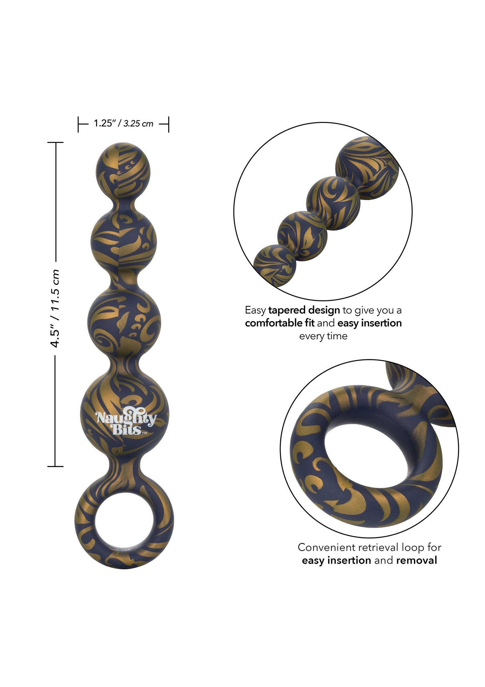 Ce petit plug est doté d’une boucle d’appel robuste en forme de « o » qui facilite l’insertion tout en apportant un confort supplémentaire. La forme effilée de la tige assure une épaisseur croissante qui intensifie le plaisir. Parfait pour les débutants comme pour les utilisateurs expérimentés. La collection Naughty Bits est faite pour se distinguer dans tous les tiroirs de table de nuit – avec un design accrocheur et des caractéristiques orgasmiques. Le silicone ultra-doux et le motif en marbre doré de ce magnifique jouet anal permettront aux amateurs les plus stylés de garder le sourire avant et après l’utilisation.
