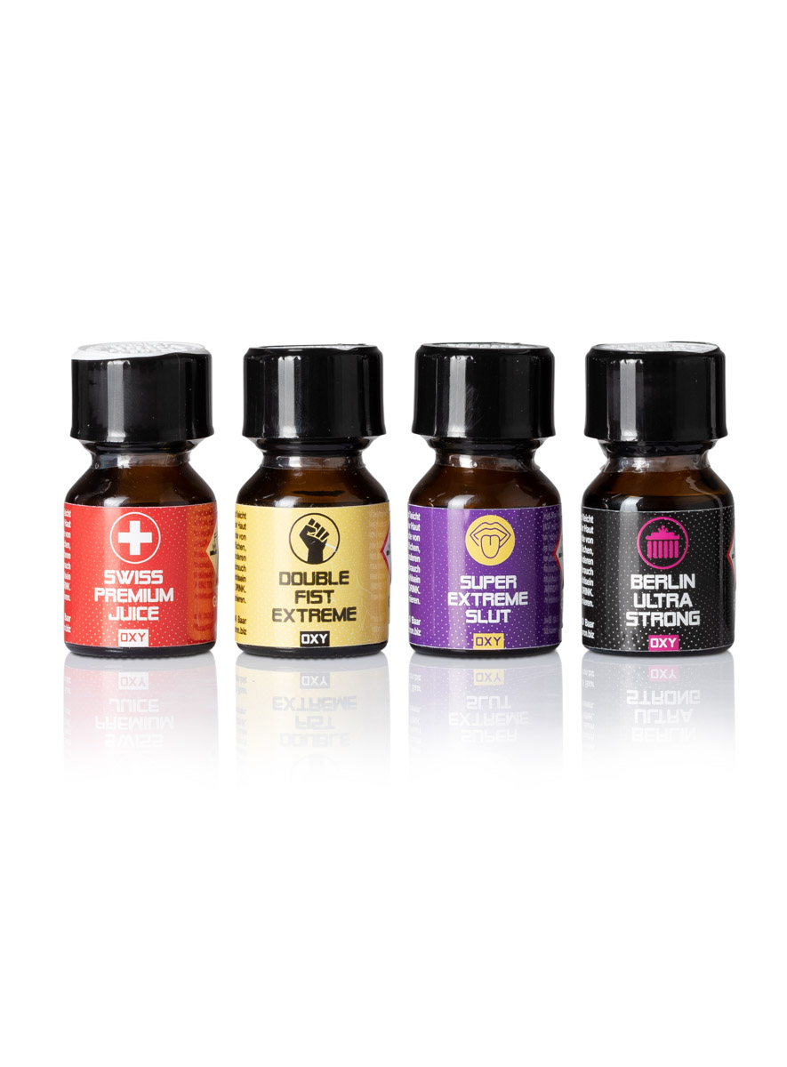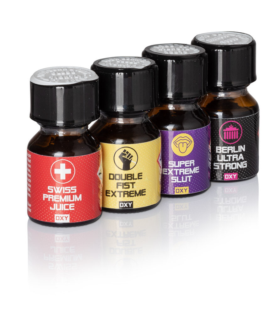 Con l’Holiday Combo 4 boccette da 10ml avrai con te l’intera OXY Edition quando sarai in viaggio. Proprio l’ideale per le festività natalizie in corso. I Popper Super Extreme Slut, se vuoi trasformare te stesso o il tuo partner in una troia senza tabù ancora più vogliosa mentre sei in viaggio. I Popper Double Fist Extreme, nel caso in cui il tuo viaggio sfoci in una sessione di pugni. I Popper Swiss Premium Juice se vuoi metterti in mostra con la croce svizzera e i Popper Berlin Ultra Strong per le esuberanti possibilità della Queer Capital. Con l’Holiday Combo hai il popper giusto per ogni sessione.