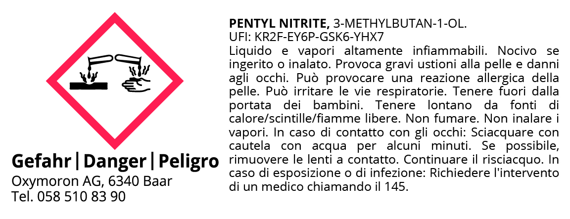 I prodotti a base di nitrito di alcool isoamilico contengono nitrito di pentile (CAS 463-04-7) e nitrito di alcool isoamilico (CAS 123-51-3). UFI: KR2F-EY6P-GSK6-YHX7