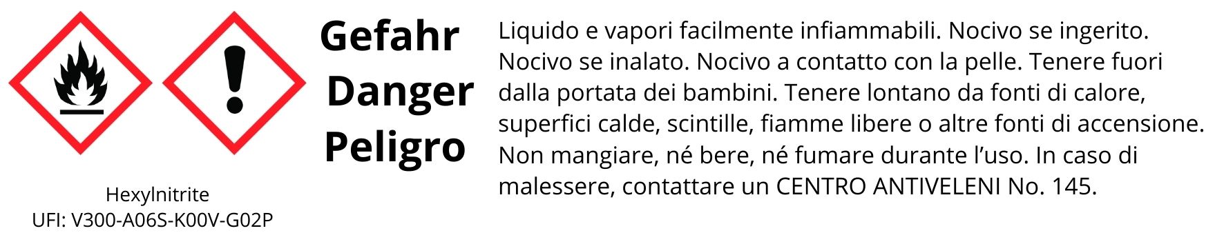 Nitrito esile (UFI V300-A06S-K00V-G02P): Nuovo nitrito dal produttore Lockerroom in Canada. Questo nitrito viene utilizzato per alcuni dei Flaconi da 30 ml prodotto dal produttore Lockerroom. Stesso o meno dannosi per la salute come il nitrito di pentile. Ecco perché offriamo prodotti con anche il nitrito di esile.