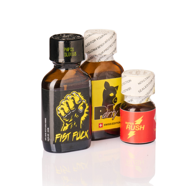 Dirty Fist Pig Poppers Combo besteht auf drei starken Poppers-Flaschen: Fist Fuck Yellow Poppers 24ml Twisted Beast, Dirty PIG Poppers 24ml und Super Rush Poppers 10ml.